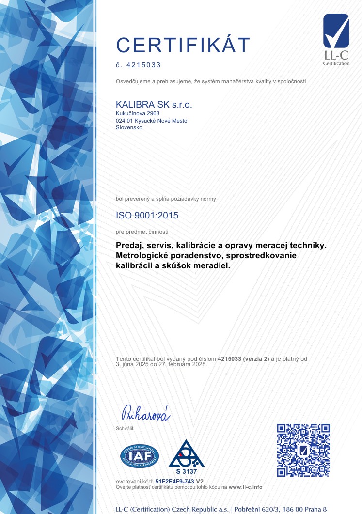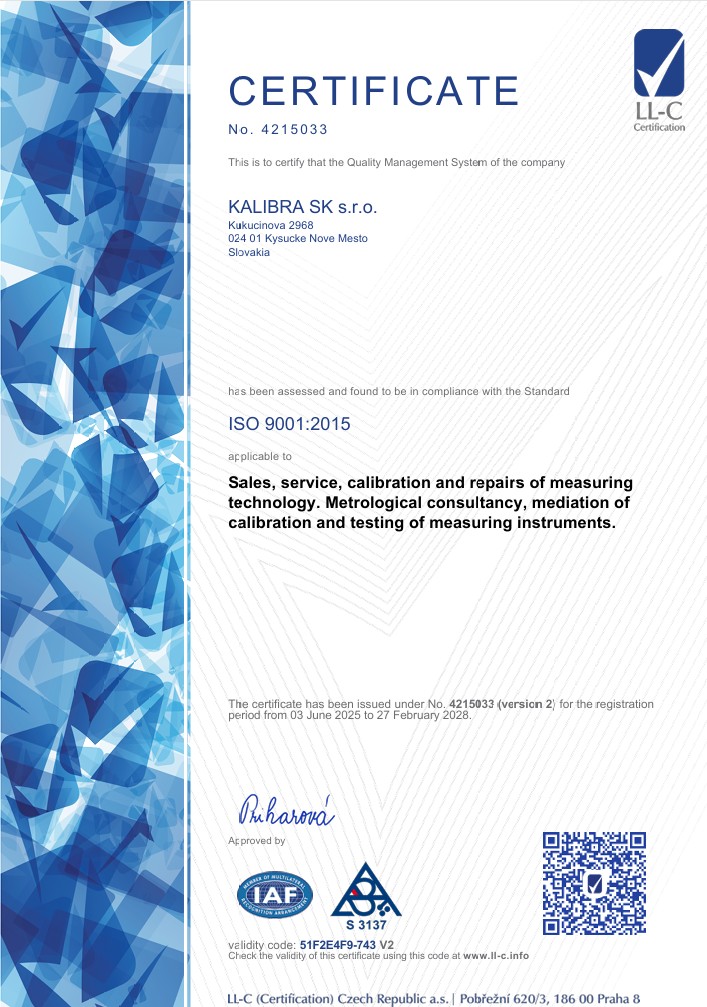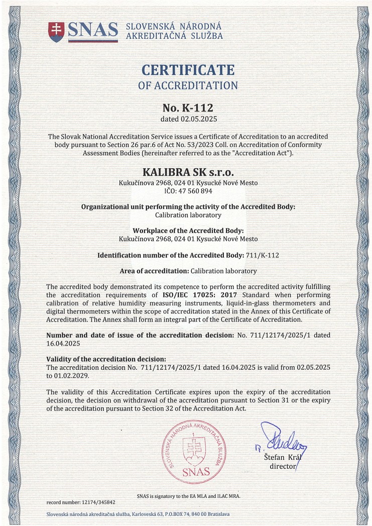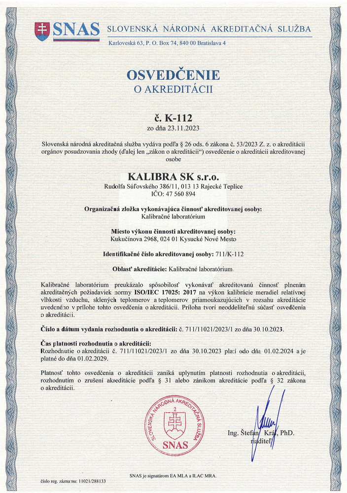 Slovenská národná akreditačná služba (SNAS) nám udelila Osvedčenie o akreditácii, identifikačné číslo akreditovanej osoby: 711/K-112 KALIBRA SK s.r.o., Kukučínova 2968 , 02401 Kysucké Nové Mesto